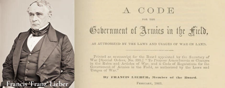 “The Lieber Code consists of 157 provisions that deal with a wide range of legal issues that must be considered in armed conflict. It contains general principles, but also very detailed rules. Among the issues addressed are whether armed force is justified by military necessity, the principle of humanity, the distinction between combatants and civilians, POW status, retaliation, and permissible methods and means of warfare.”