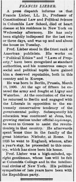 The 1806 Articles of War did not address many issues facing Union commanders during the Civil War, such as the management and disposition of prisoners of war, guerilla and partisan fighters, and escaped slaves. General-in-Chief Henry Halleck commissioned Professor Lieber to write a set of guidelines that were specific to “modern” warfare. Once these were established, an editorial committee of Union generals (E.A. Hitchcock, Geo. Cadwalader, G.L. Hartsuff, and J.H. Martindale) went to work revising these guidelines. Once they were completed, Halleck requested that Lieber write a set of comprehensive military laws to govern the prosecution of the war. This would give each Union military commander a set of rules to follow in their engagements with Confederate forces and in occupied civilian territory.